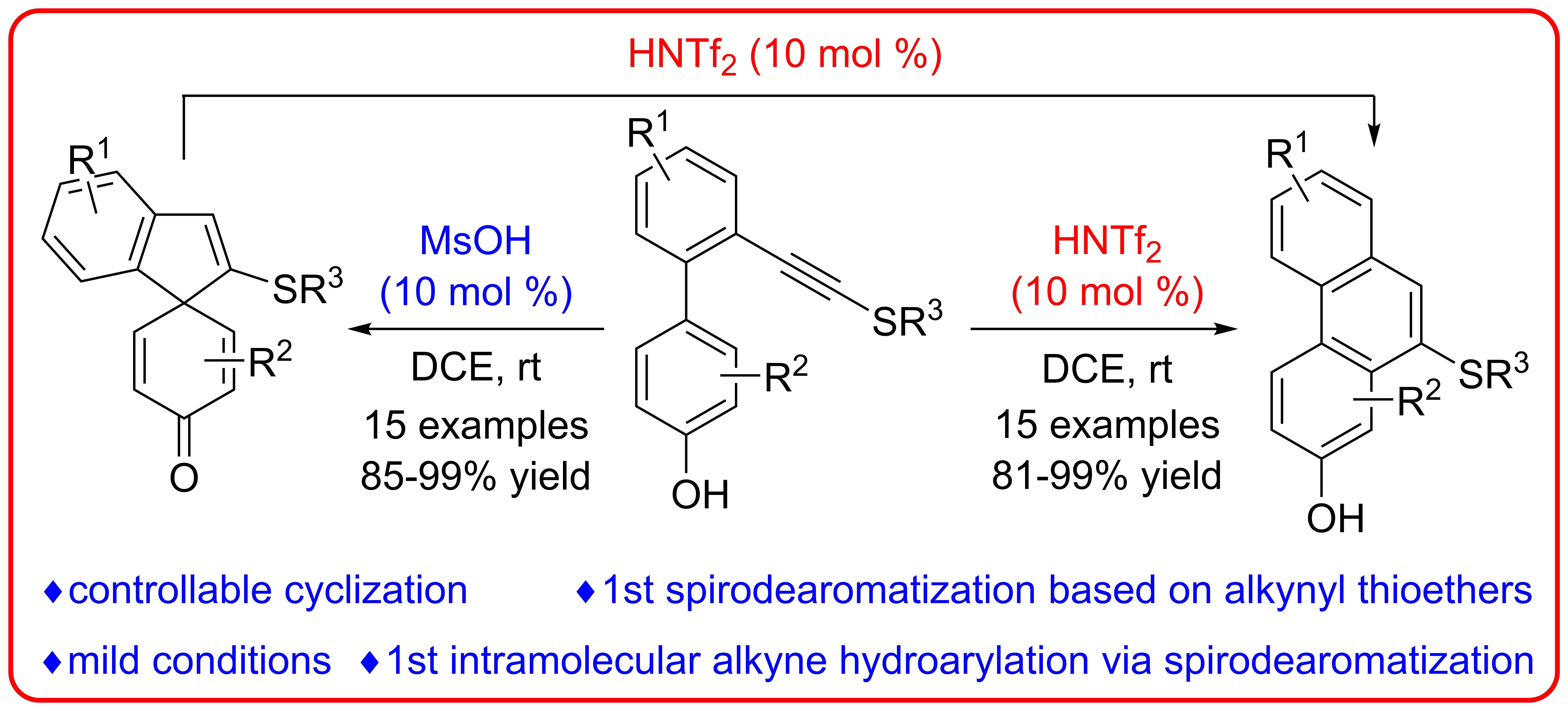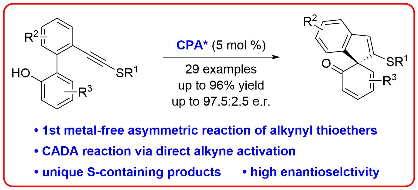 157. Chiral Brønsted acid-catalyzed asymmetric dearomative spirocyclization of alkynyl thioethers.