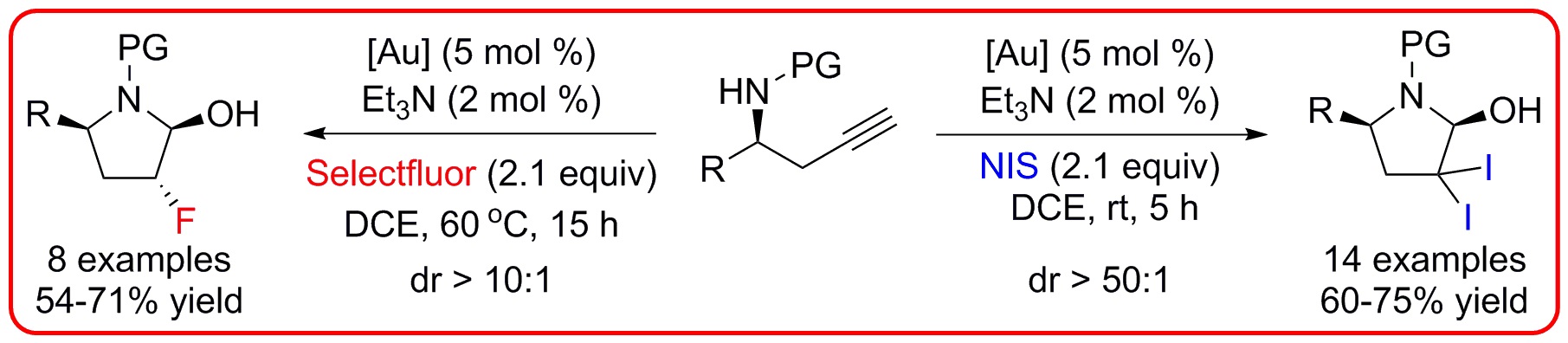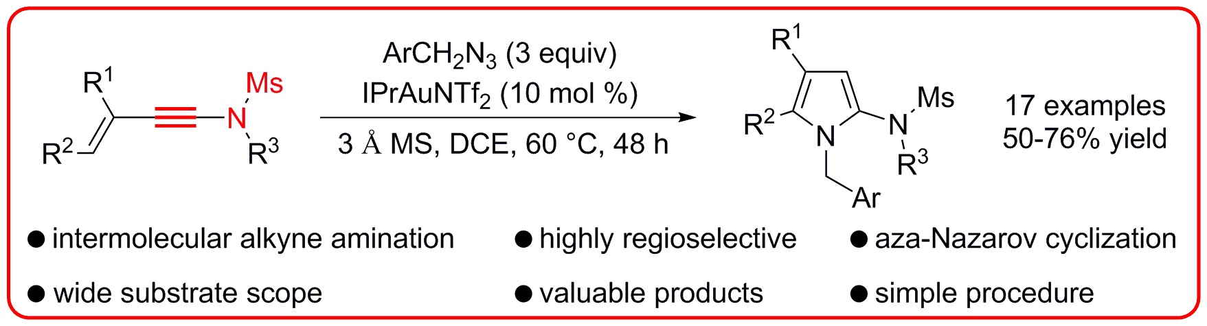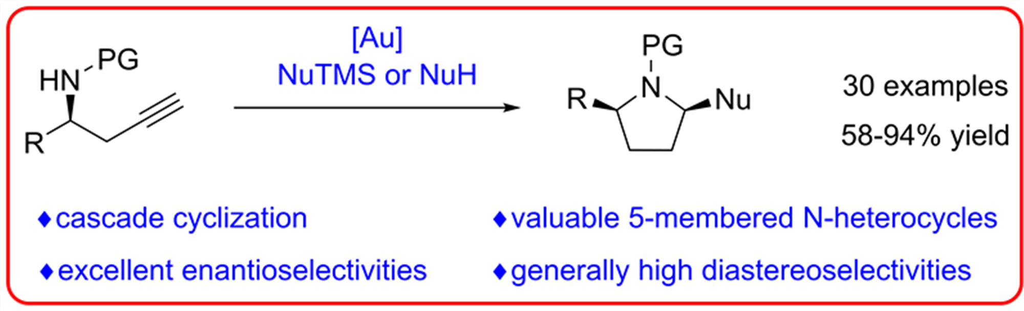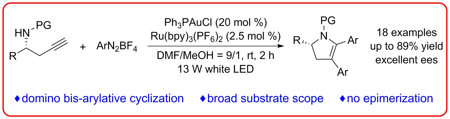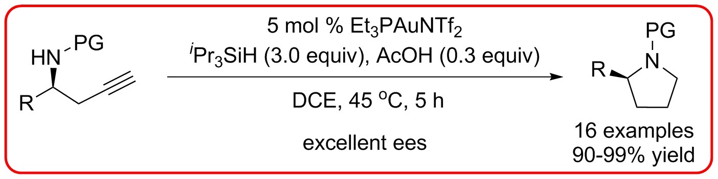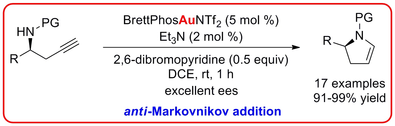 40. Efficient and Practical Synthesis of Enantioenriched 2,3-Dihydropyrroles through Gold-Catalyzed Anti-Markovnikov Hydroamination of Chiral Homopropargyl Sulfonamides.